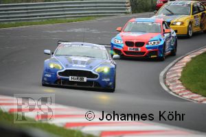 Marc Basseng bei der Überrundung des langsameren Aston Martin Vantage GT4 (Startnummer 179 vom MSC Adenau) problemlos vorbei