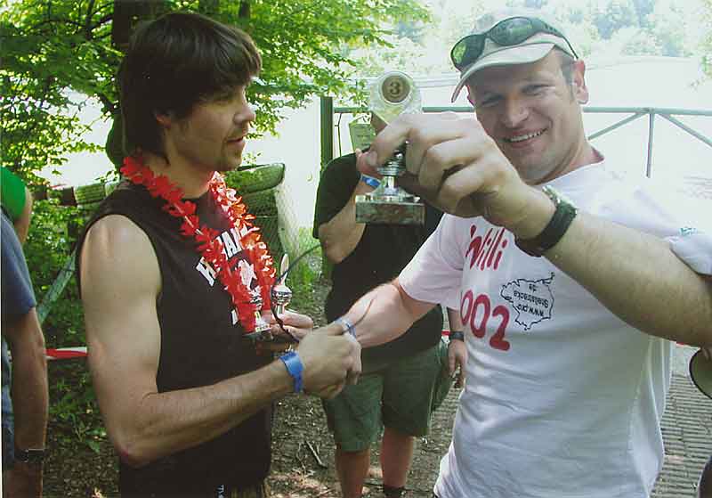Die Youngtimer Eifelburki, Schulden Udo und Gunna hielt der Regenschauer nicht davon ab, auch in diesem Jahr wieder per pedes den Rückweg anzutreten. Glücklicherweise fand sich im Rucksack von Burki eine Flasche Wippermann Wacholder, die er seinerzeit für die Lösung des Rätsels aus unserem Forum gewonnen hatte. Ja, auch die Mountenbiker im Klostertal konnten dieses Getränk nicht ausschlagen. Neben einem Redeanfall von zwei Stunden - Gunna kennt nun alle Geheimnisse der beiden Brüder - verwandelte der Wacholder die beiden Brüder in baumstemmende Monster.