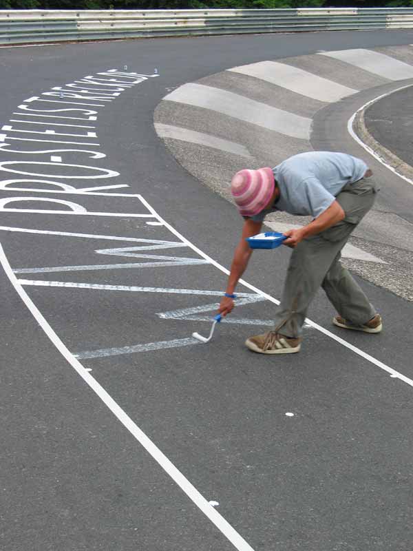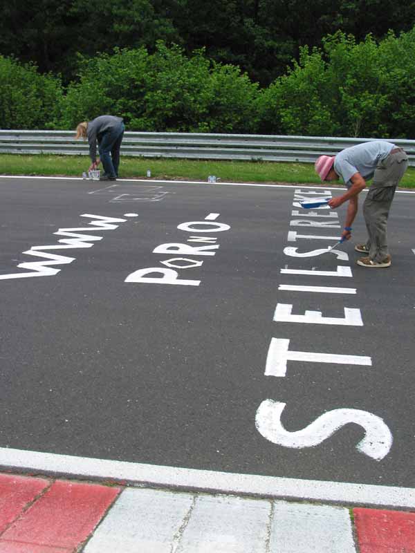 Am frühen Nachmittag jedenfalls trudeln die nächsten Steilstreckler ein. Als sich die neuen 24h-Rennen-Streckenfahrzeuge bei Kapt. AHAB verabschieden, konnten wir damit starten, unsere Schriftzüge im Karussell, auf dem Weg dorthin und in der Klostertalkurve zu erneuern. Auch in diesem Jahr hat es unser ( Maler - ) Meister wieder richtig gut hinbekommen, obwohl einer der ganz wichtigen Ingenieure in diesem Jahr nicht mitwirken konnte.