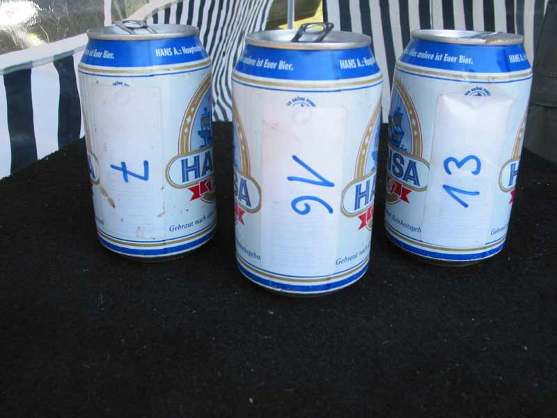 Wie auch im vergangenen Jahr mußte hier zunächst im Qualifying die Distanz von 5m unter die Dose gebracht werden. Nachdem alle Teilnehmer mit neuen Sportgeräten vom Ausrüster Hans. A ausgestattet waren, gingen die 38 Startern/-rinnen - unter ihnen neben vielen Erfahrenen und Bekannten aus dem letzten Jahr auch der ein oder andere Rookie - an den Start. Schnell stellte sich heraus, daß die Dosen in diesem Jahr besonders schnell sind - zu schnell für Rookie Heini; seine Dose stoppte bereits nach 2m.