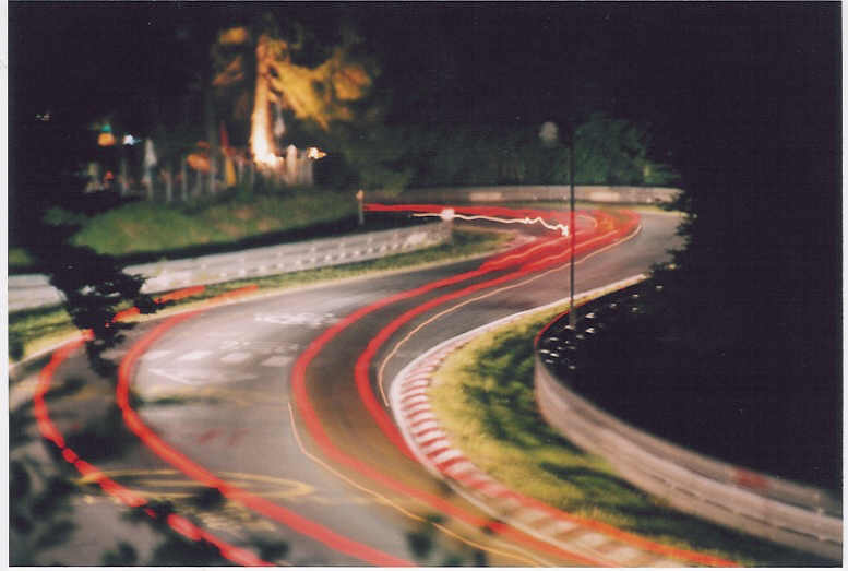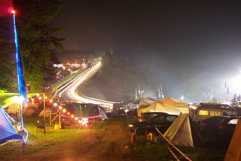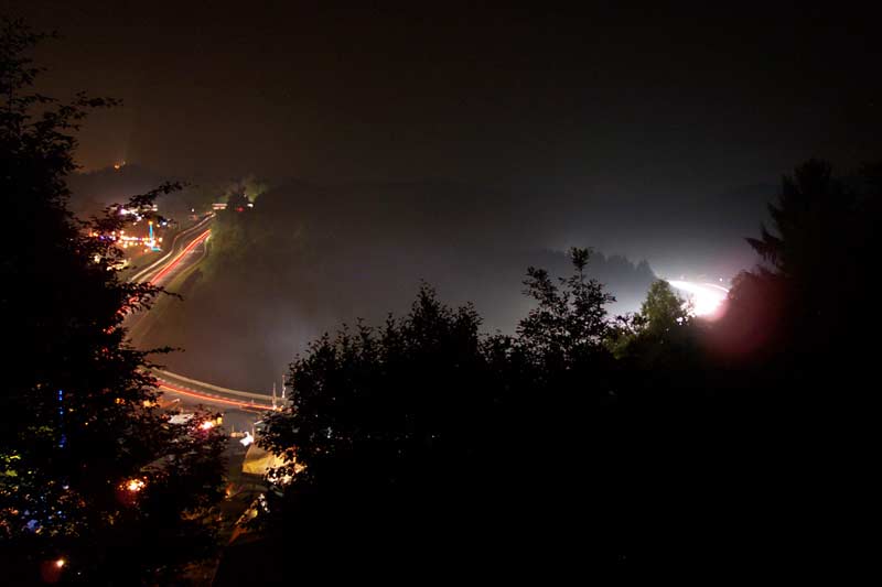 Die abschließenden Nachtwanderung von Adenau zurück zur Steilstrecke wurde sogar für die erfahrenen 24h-Rennenfans zu einem ganz neuen Erlebnis. Die Hände vor Augen nicht sehen könnend ist auf die Streckenkenntnis von Eifelburki absolut Verlass. Nach gut einer Stunde im Schwarz des Waldes stehen wir plötzlich mitten im Karussell und sind "überhaupt nicht mehr allein".