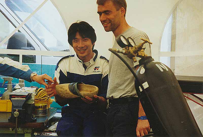 Für die meisten der Teams stand an diesem Tag die technische Abnahme auf dem Programm. So auch für die Schnitzer-Werks-BMW und die Dodge/Chrysler Viper. In der separaten Box des Falken Motorsport Teams wiesen wir die Mechaniker in die Geheimnisse der für uns gewöhnlichen Holzschuhe ein: Hoffentlich treten die nächstes Jahr nicht mit Holzreifen an, nachdem wir denen was von "special grip, hihihi" erzählt haben.