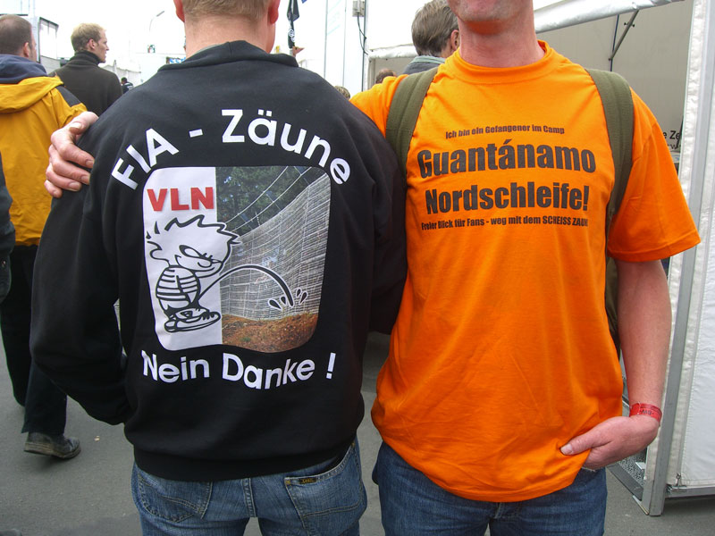 100 orangefarbene T-Shirts brachten Kappa und Knatze mit in die Eifel. Die FIA-Zaun-Protest-Shirts konnten alle für wenig Geld an die Fans verteilt werden. Die T-Shirts mit dem Aufdruck „Ich bin ein Gefangener im Camp Guantánamo Nordschleife! Freier Blick für Fans – weg mit dem SCHEISS ZAUN!“ brannten sich in die Pupillen der Nordschleifen-Jünger ein. Danke für diese Aktion!