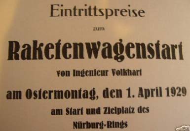 Der Ostermontag fiel 1929 auf den 1. April. Es waren Raketenfahrzeuge auf dem Nürburgring angekündigt, allerdings war dies kein Aprilscherz. Der Ingenieur Curt Volkhart demonstrierte auf der Start- und Zielgeraden seinen Raketenwagen und sein Raketenmotorrad. Bei dem Raketenwagen wurden 24 Raketen und bei dem Raketenmotorrad 6 Raketen gezündet.