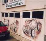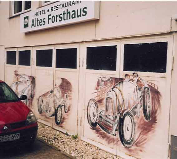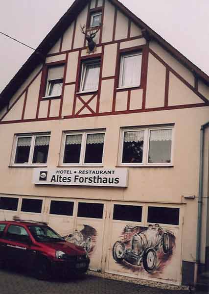 Das „Alte Forsthaus“ gibt es heute noch. Neben dem Namen „Altes Forsthaus“ weisen die Graffiti-Zeichnungen an den Garagentoren auf diesen weltbekannten historischen Platz im Ort Nürburg hin.