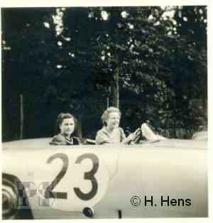 Mathilde Königs und Freundin Schwanhilde bei der Sitzprobe im Mercedes 300 SL von Theo Helfrich.