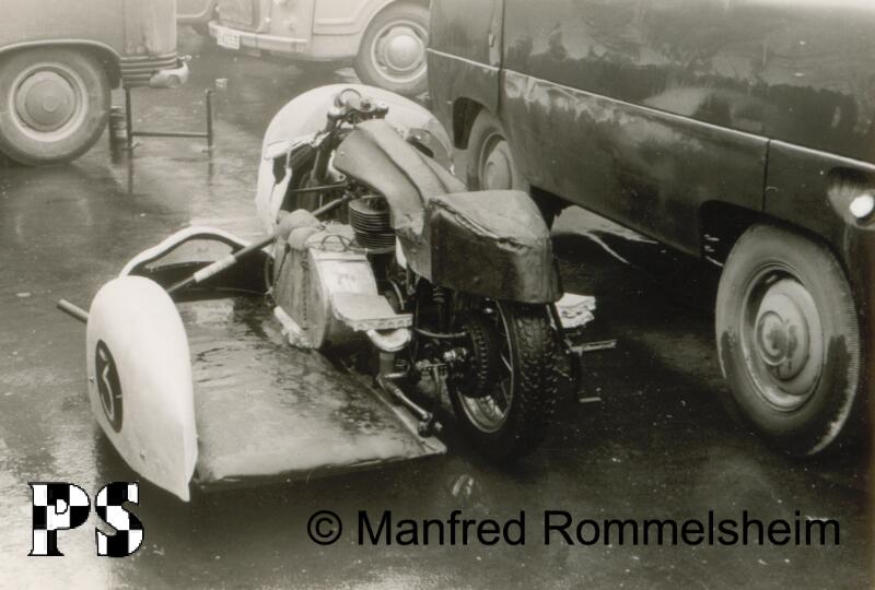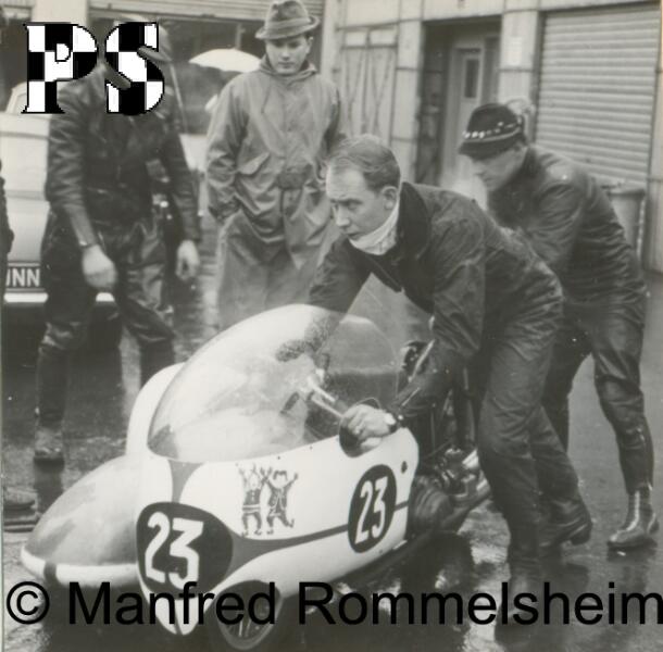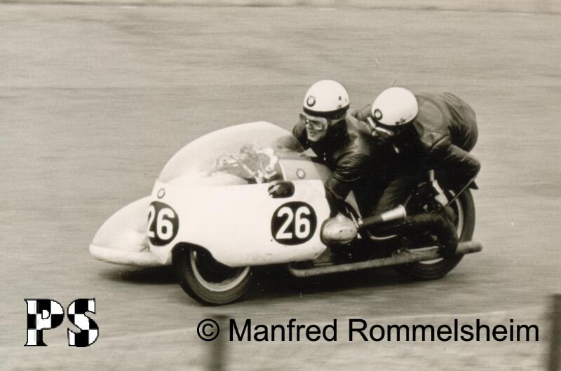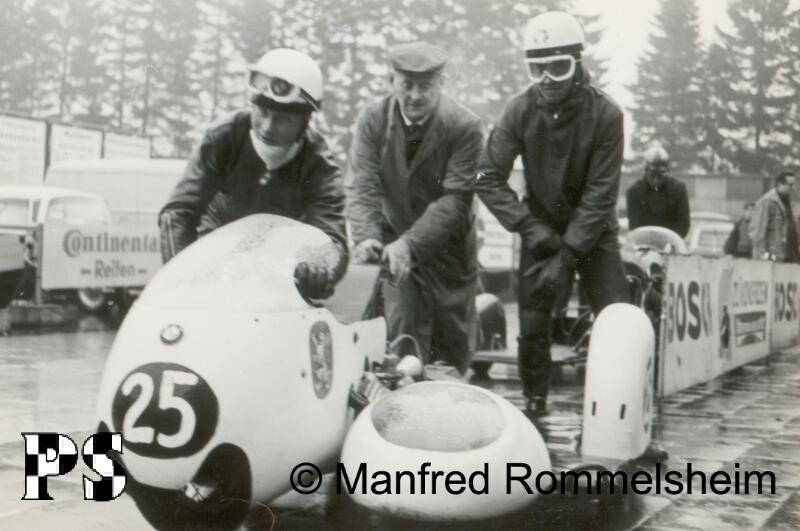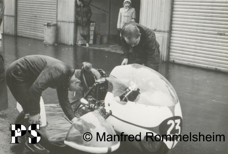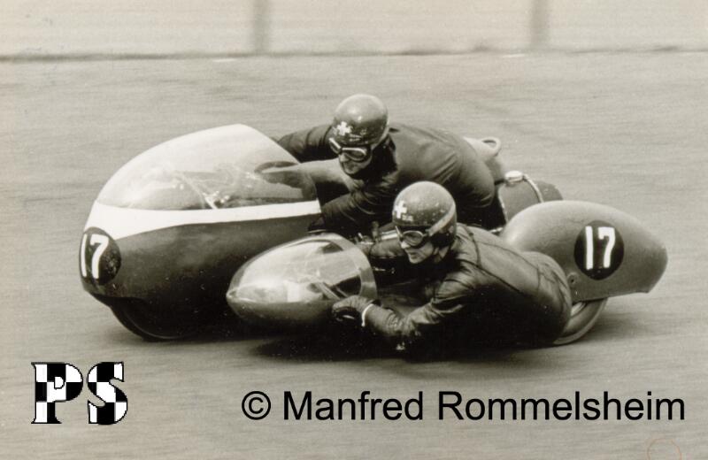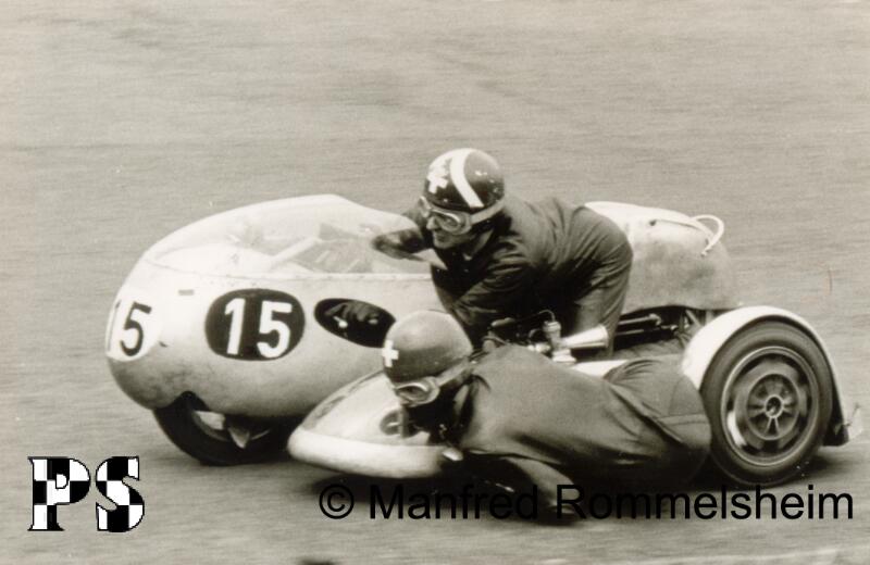 Im Gespann-Rennen übernahm Max Deubel bis zur Müllenbach-Kurve die Führung. Anfang der zweiten Runde führte Fritz Scheidegger vor Max Deubel und Peter Harris. Starker Regen setzte ein und auch Graupelschauer gingen nieder. Somit wurde das Rennen ein Kampf gegen das Wetter. Von 24 Startern sahen nur 10 die Zielflagge. Mit über einer Minute Vorsprung gewann Scheidegger vor Schauzu und Butscher.