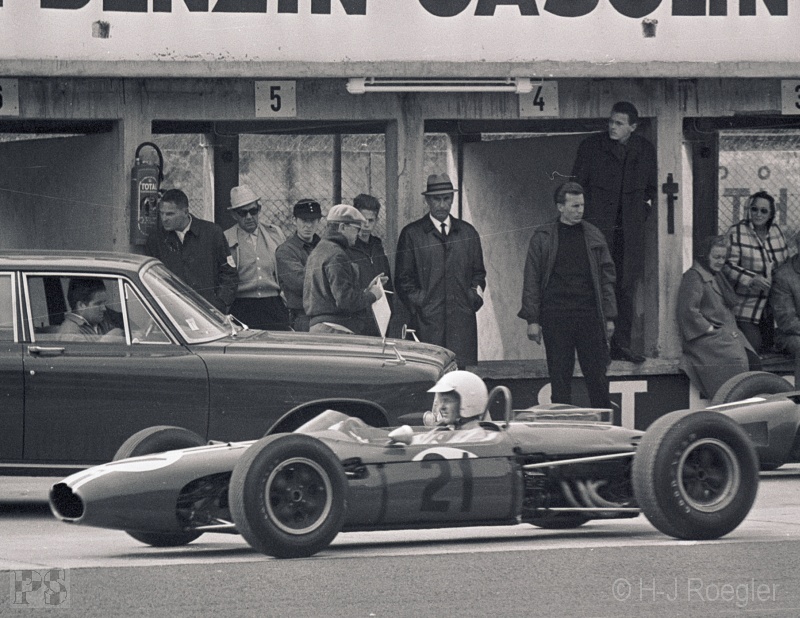 Der einzige deutsche Fahrer Gerhard Mitter musste an achter Stelle liegend seinen Lotus 25 abstellen.