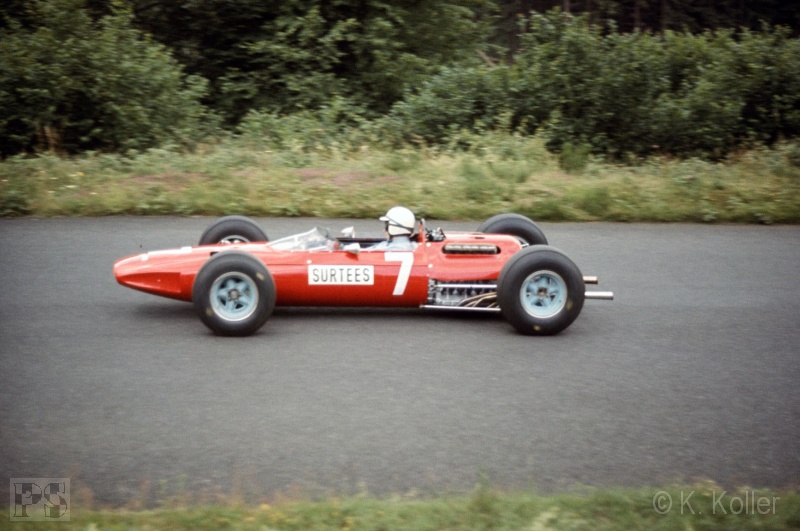 wurde bis an das Ende des Feldes durchgereicht. Nach der ersten Runde hielt John Surtees mit seinem Ferrari
