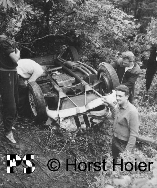 Der Brite Dick Protheroe verunglückte mit seinem Jaguar E-Type (Startnummer 94) beim Training am Freitag im Streckenabschnitt Flugplatz. Der Jaguar wurde von der Strecke getragen. Dick Protheroe erlitt zum Glück nur eine leichte Gehirnerschütterung.
