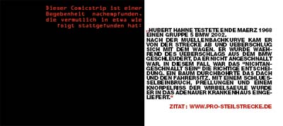 Karl-Heinz Becker und Arthur Schneider waren mit einem Martini-BMW in der Klasse bis 1300 ccm Hubraum der Prototypen beim 1000-Kilometer-Rennen 1966 am Start. Wer von den beiden Fahrern den ersten Turn gefahren war, ist leider nicht bekannt. In der 7. Runde blieb der Martini-BMW bei km 22,5 im letzten Anstieg vor dem Start- und Zielbereich liegen. Der Wagen stand zu 1/3 auf der rechten Fahrbahn und dass an einer Stelle, wo die Rennwagen mit ca. 200 km/h vorbei rauschen. Zunächst versuchte der Fahrer per Anlasser den Wagen wieder in Gang zu setzen. Danach hantierte er 3x im Motorraum, um den Wagen zu starten. Während dieser leichtsinnigen Aktionen erhielt er Zeichen von den Streckenposten sein Auto direkt an die Eifelbüsche zu stellen (Leitplanken waren damals am Nürburgring, aber auch an anderen Rennstrecken noch ein Fremdwort). Der Fahrer ignorierte die Anweisungen der Streckenposten. Daraufhin eilte ein Streckenposten zum Fahrer, um ihm zu helfen. Hilfe aus Sicherheitsgründen darf in Anspruch genommen werden und führt nicht zum Ausschluss aus der Wertung. Diese Regelung in Sportgesetz war dem Fahrer aber wohl unbekannt und er verjagte den Streckenposten.