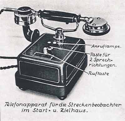 Einzigartig in ihrem Aufbau und Umfang war die Fernsprechanlage für den Sanitäts- und Beobachtungsdienst. Auf der Gesamtstrecke waren in 10 Blockhäusern die Hauptbeobachter- und Sanitätsposten untergebracht. (In späteren Jahren wurde die Zahl der Hauptposten auf 16 erhöht). Die getrennten Fernsprechleitungen für die beiden Dienste führten in die im Start- und Zielhaus untergebrachte Glühlampe-Telefonzentrale.