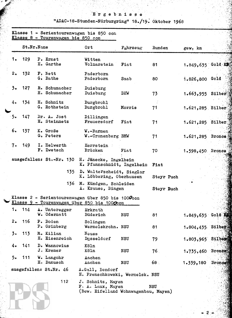 Ergebnisse Klasse T / 5 - Serientourenwagen bis 1300 ccm Hubraum