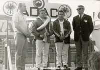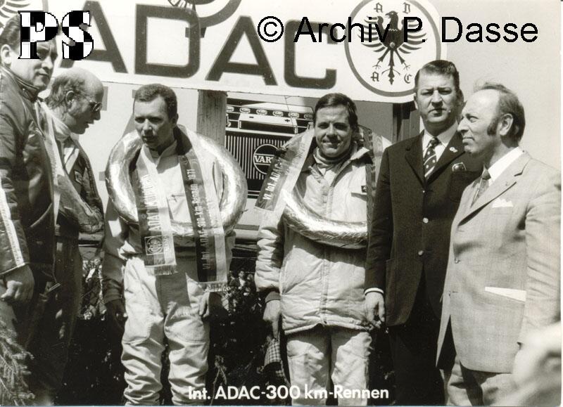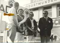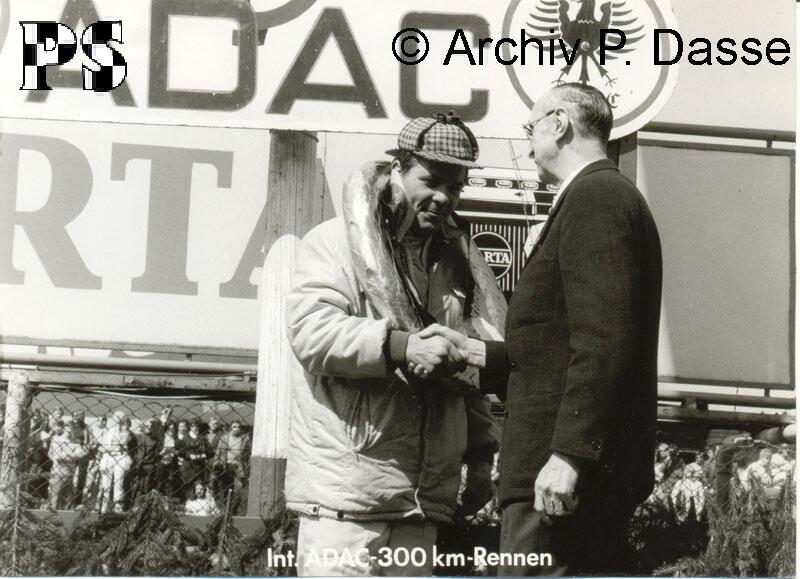 Paul Bergner mit seinem Markenzeichen, der Sherlock-Holmes-Mütze bei der Siegerehrung. War für Hans Heyer der Tiroler Hut ein Marken- und Erkennungszeichen, so war dies für Paul Bergner die Sherlock-Holmes-Mütze. Paul Bergner hatte die Mütze in der 60er Jahren auf der Racing Car Ausstellung in London gekauft. Die Racing Car Ausstellung war damals die wichtigste Motorsportausstellung in Europa.