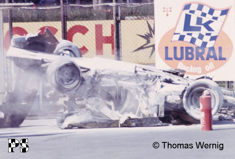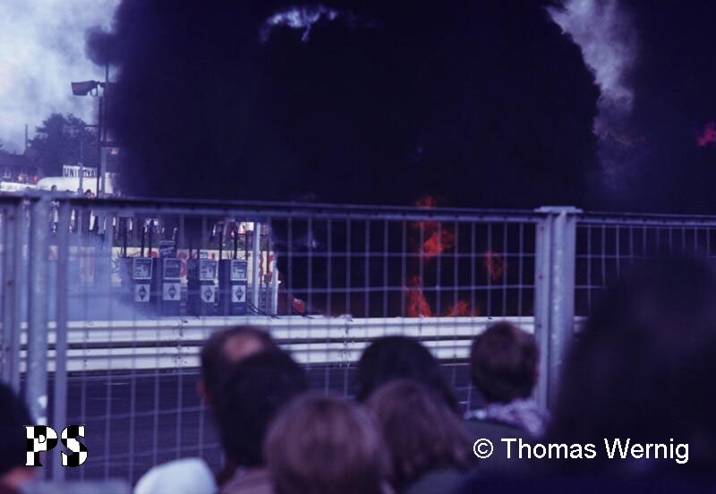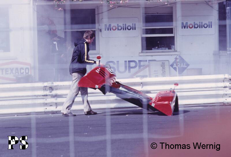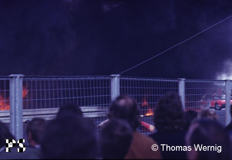 Der McLaren von Franz Pesch raste mit starkem seitlichen Drift voll in die vor dem Start- und Zielhaus installierte Tankanlage und riss zwei Zapfsäulen aus der Verankerung. Bei dem Aufprall wurde der Vorderwagen des McLaren total zerstört. Teile der Karosse flogen bis zu 50 Meter weit. Franz Pesch konnte dem Wrack unverletzt entsteigen.