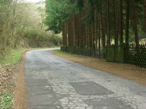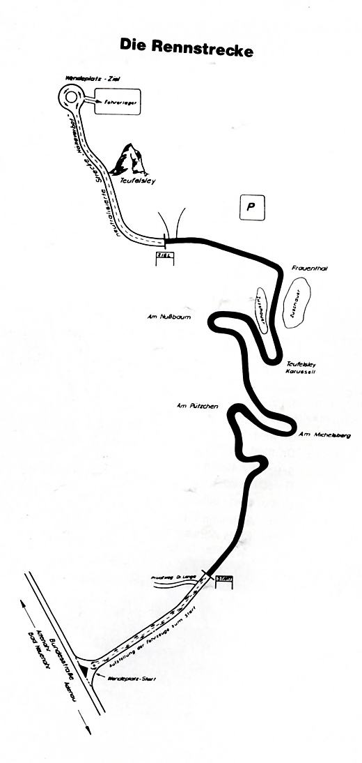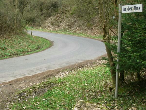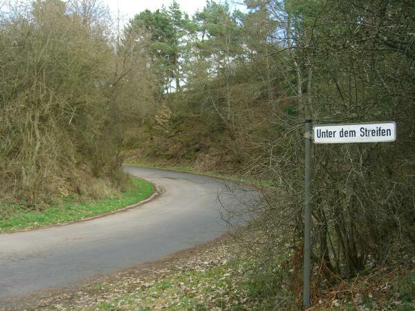 Das Ziel unseres diesjährigen Osterurlaubs war das wunderschöne Ahrtal. Auf dem Campingplatz Altenahr bezogen wir für 6 Tage unser Quartier. Bei allerbestem Eifelwetter wurde das Ahrtal per Pedes und Fietsje erkundet. Zufälligerweise befindet sich in der Nähe des Ahrtals nicht nur der Nürburgring sondern auch die Straße, auf der das Bergrennen Bad Neuenahr in der 1960er Jahren ausgetragen wurde. Fast auf dem Tag genau 44 Jahre nach dem Bergrennen 1965 machte ich mich auf zur Spurensuche. Die alte Streckenkarte zum Bergrennen Bad Neuenahr besagte, dass das Ziel des Bergrennens kurz vor dem sagenumwobenen Felsen Teufelsley lag. Gut ausgerüstet mit der historischen Streckenkarte, der Wanderkarte des Eifelvereins und der Fotoausrüstung ging es Richtung Dümpelfeld bzw. Teufelsley. Der untrügliche Orientierungssinn, geschärft durch viele Wanderungen an der Nordschleife und in der Eifel, führte mich direkt zum Ausgangspunkt des Bergrennens: der Startbereich zum Beginn der Ommelbachstraße.