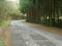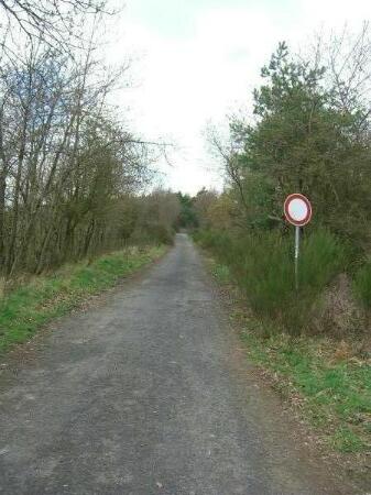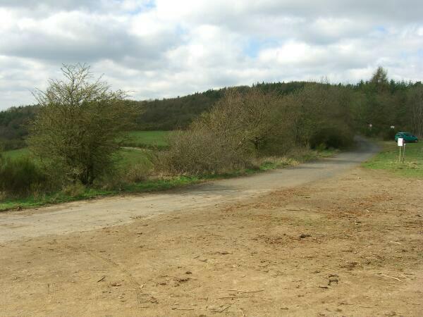Der Zustand der Straße verschlechterte sich im oberen Bereich immer mehr. Kurz vor dem ehemaligen Zuschauerbereich ist die Teerdecke stark beschädigt. Hinter dem Zuschauerbereich ist die Teerdecke verschwunden. Jetzt wird hier der Eifelwanderweg ausgeschildert. Von hier aus hat der Eifelwanderer einen herrlichen Blick über die Eifel. Am Horizont erhebt sich der Aremberg, der Namensgeber für einen Streckenabschnitt der Nürburgring-Nordschleife ist.
