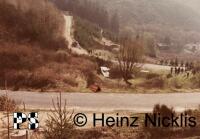 Zu Fuß ging es die historische Bergstrecke bergauf. Die 3,7 Kilometer lange Strecke hat ihre Bezeichnung als Bergrennen zu Recht. Nach ca. 1 Kilometer in der ersten echten Bergkurve kam ich ins Gespräch mit Heinz Nicklis, der meine Spurensuche bemerkte. Heinz Nicklis entpuppte sich als Zeitzeuge des Bergrennens. Nach einem netten Gespräch und der Zusage, ein Bild von einem Unfall mit Rolf Stommelen zuzusenden, verabschiedete ich mich und ging weiter hoch zur Teufelsley. Das Bild von Rolf Stommeln traf schon in der folgenden Woche im Münsterland ein.