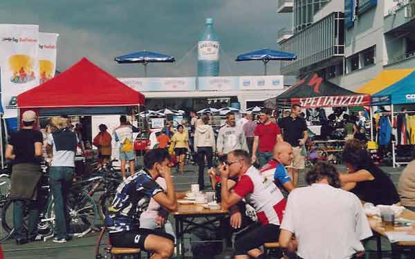 Am Samstagvormittag ging es dann zum Fahrerlager und zur Anmeldung. Hier herrschte dann bei uns und auch einigen anderen Radtouristen deutliche Verwirrung, da die (spärlichen) Informationen von der RadamRing-Homepage nicht mit der Wirklichkeit übereinstimmten. € 15,- Startgebühr für eine Nordschleifenrunde pro Person (man konnte auch mehr Runden fahren) waren ein zu stolzer Preis. Das Volksradfahren fand nur auf der Grand-Prix-Strecke statt.