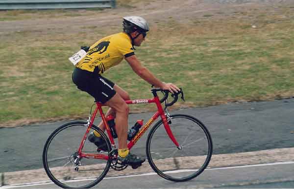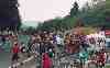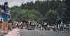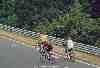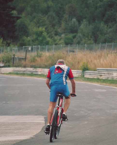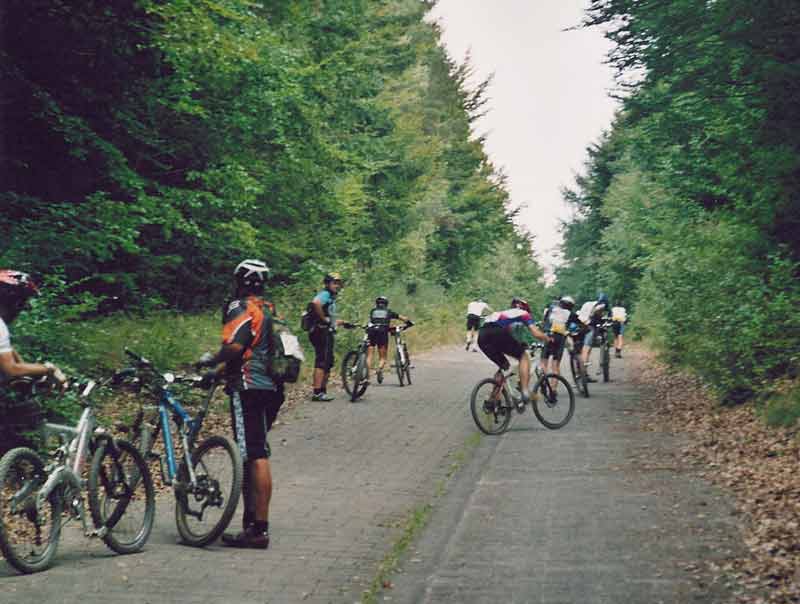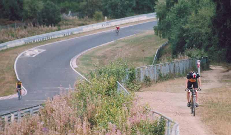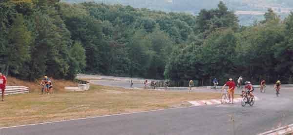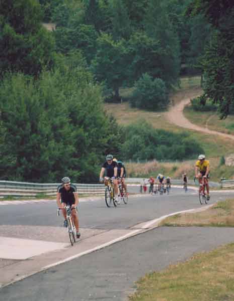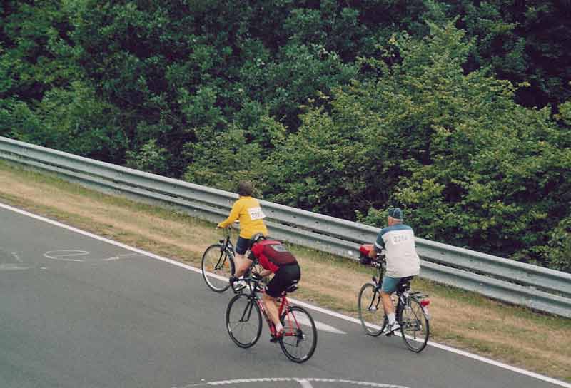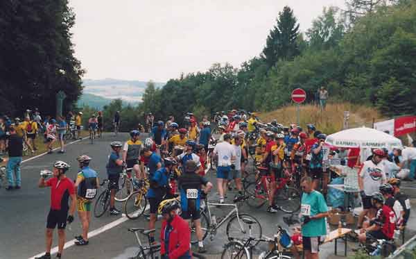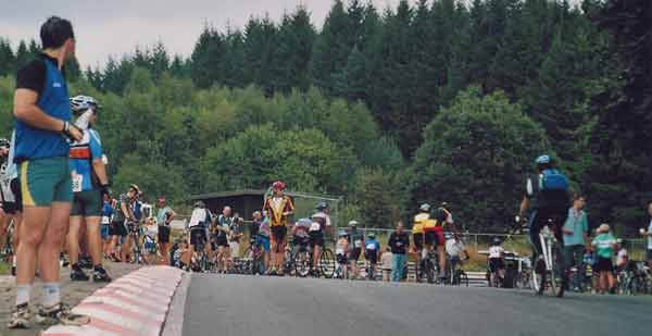 So machten wir uns über die wilden Pfade des Nürburgrings zur Steilstrecke auf. Im Streckenabschnitt ‚Hohe Acht’ war die übliche Verpflegungsstation aufgebaut. Viele, viele erschöpfte Fahrer hatten den Anstieg ab dem Bergwerk nicht durchstehen können und schoben ihre motorlosen Rennmaschinen die Berge hinauf.