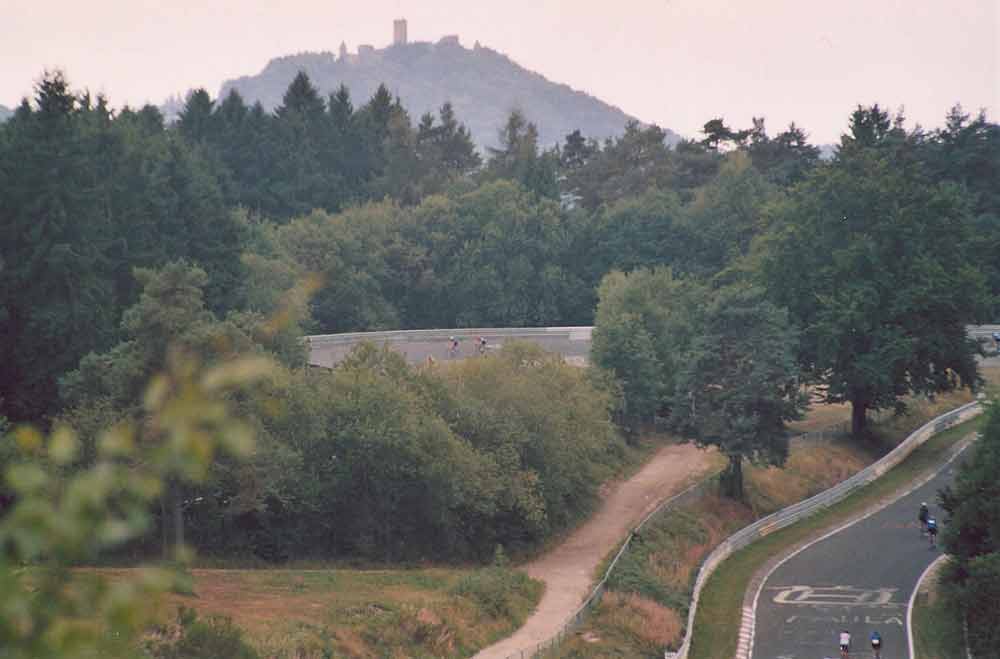 Beim Anblick der Bergabpassage von der Hohen Acht entgegen der Fahrrichtung zum Karussell kamen noch mal die actionreichen nächtlichen Bobby-Car-Fahrten in Erinnerung. Wie hatten wir es geschafft, diese halsbrecherische Strecke mit diesen filigranen Fortbewegungsmitteln beim diesjährigen 24h-Rennen unverletzt zu überstehen? Die Antwort kennt einzig und allein Hans A.