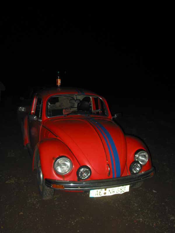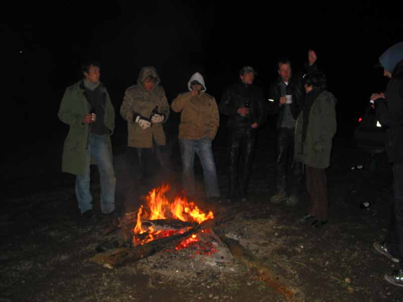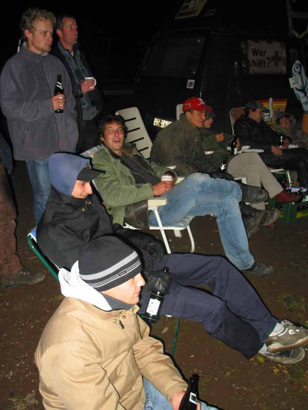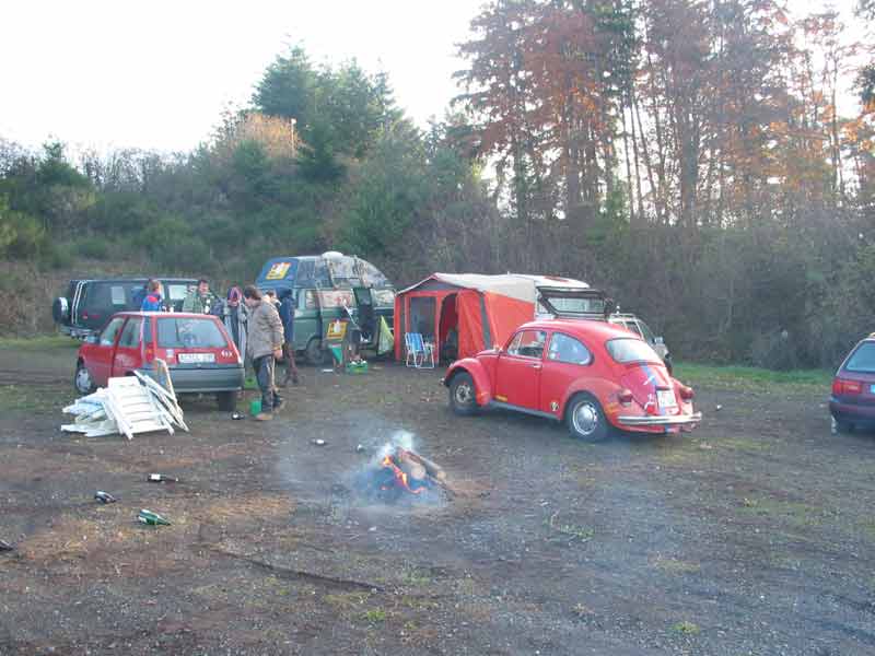 Während andere den ganzen Abend in Dixies ...-Mobil verbringen, holen wir uns am Lagerfeuer noch die nötige Schlafsacktemperatur, obwohl uns der Wettergott in diesem Jahr mit Sturm und eisigem Regen verschont. Zudem scheint der Opel als Übernachtungsmöglichkeit wesentlich besser geeignet zu sein als der Käfer im letzten Jahr.