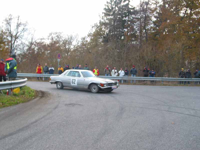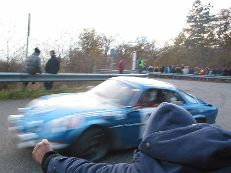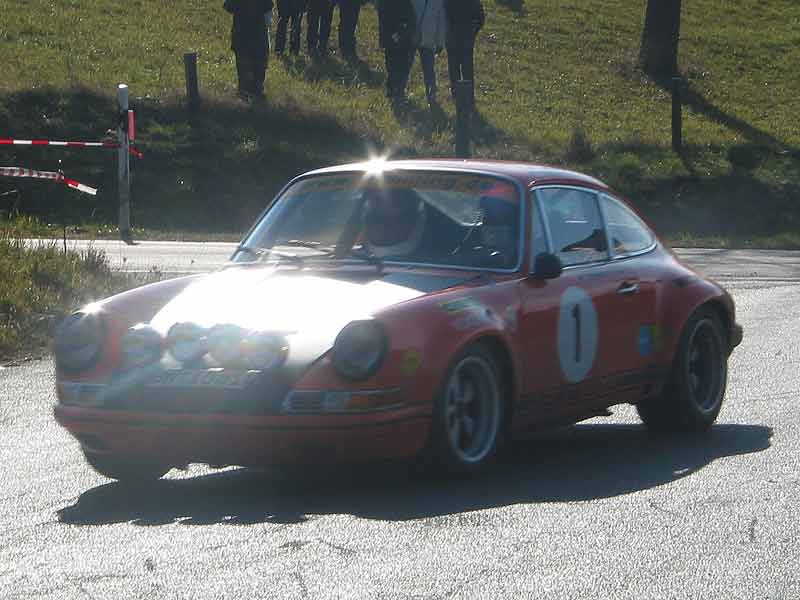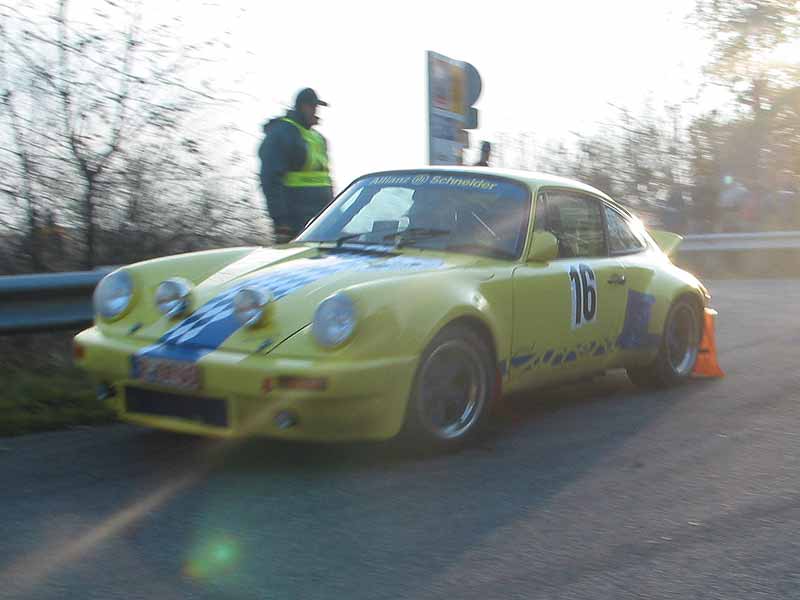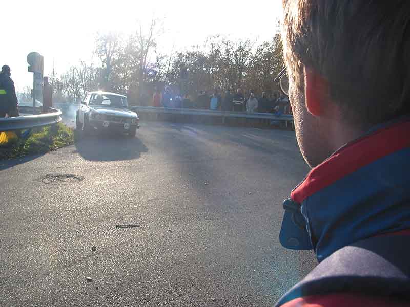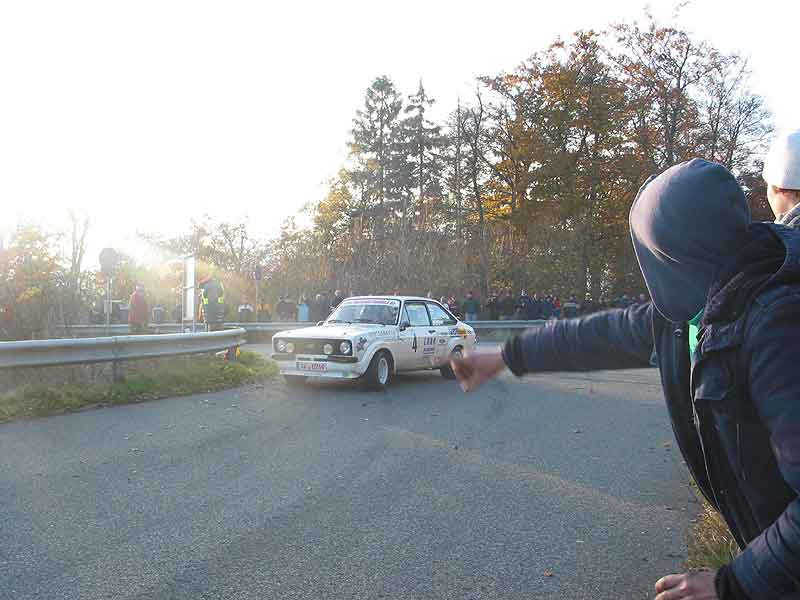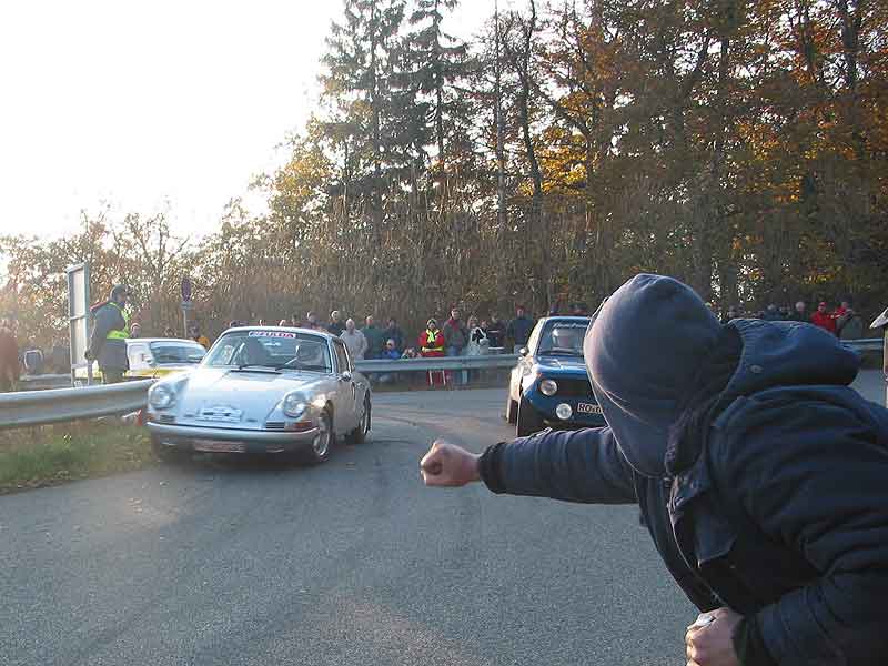 Der Verlauf an diesem Streckenabschnitt läßt uns auf einige Drifts hoffen; später sind wir jedoch von den meisten Fahrzeugen enttäuscht. Natürlich gibt es wie immer Ausnahmen: Das soll in diesem Fall zum einen der Käfer aus der Gruppe der Vorfahrzeuge sein - der Pilot ist an diesem Tag eh so übermotiviert, daß er bei einer späteren WP mit seinem Heckmotor in den Planken landet und die Veranstaltung für ihn zu Ende ist - zum anderen sorgt der Star der diesjährigen Rallye "unser Walter" mit einem Hammer-Quersteher dafür, daß auch an diesem so sonnigen Tag die Eifel vernebelt ist. Aber: Auch "der Lange" scheidet mit den 911er bei einer darauffolgenden WP zur Enttäuschung unser aller aus. Wir hätten gerne mehr von dem Nebel gehabt.