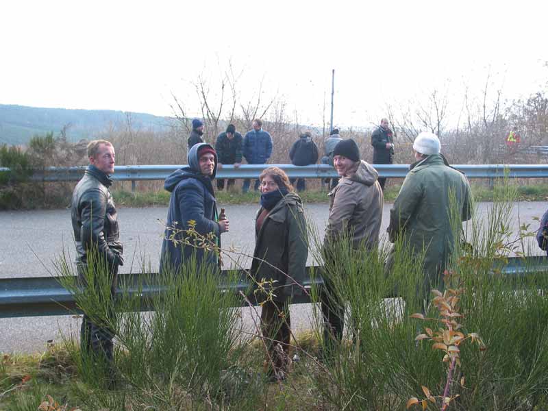 Der Feierabendverkehr stört uns eher weniger - wir wissen, daß wir es wohl nicht zur Fahrzeugabnahme und zur ersten Etappe bei Mayschoss schaffen werden. Unsere Hütter "pro-Steilstrecke"-Fraktion allerdings ist bereits vor Ort und empfängt Walter Röhrl & Co. mit großem Bahnhof. Dennoch schaffen es Alesi und Freunde nicht rechtzeitig, die Motorhaube des Winterkäfers für ein Autogramm vom Rallye-Gott zu demontieren.