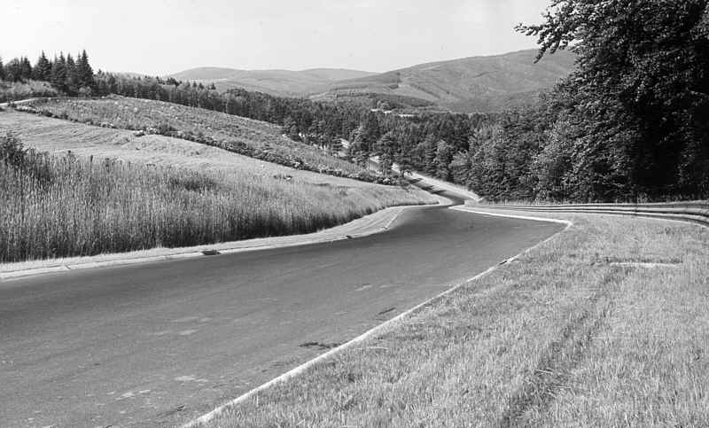Blick entgegen der Fahrtrichtung zur Postbrücke und Arembergkurve.