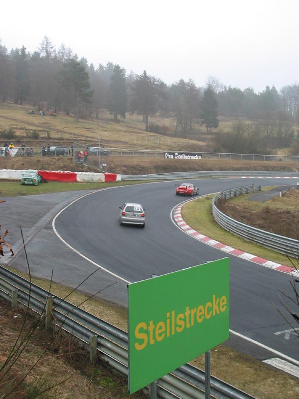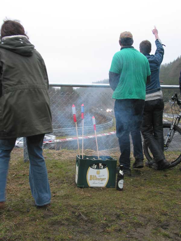 Nach einem sehr informativen Vormittag zieht es uns dann endgültig raus in die noch nicht sehr grüne Eifel. Weil wir pünktlich zu Rennbeginn im Klostertal sein möchten, stellen wir im Erlebnispark Brünnchen unser Auto ab. Der Parkplatz ist bereits gefüllt mit Autos und Wohnmobilen, die Gemeinde der VLN-Fans feiert wieder ihre Party. Die Curry-Fritte ist immer noch teuer und schmeckt nicht besonders gut. Die Kalorien sind allerdings notwendig, denn jetzt geht es hoch! Neben etwas flüssiger Marschverpflegung müssen wir zu allem Überfluß auch noch Brennholz mitschleppen. Ein Glück, daß wir den Ballast nur die Steilstrecke runterschleppen müssen!
