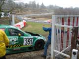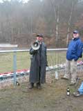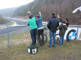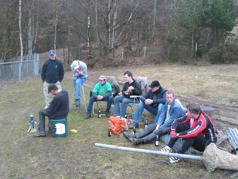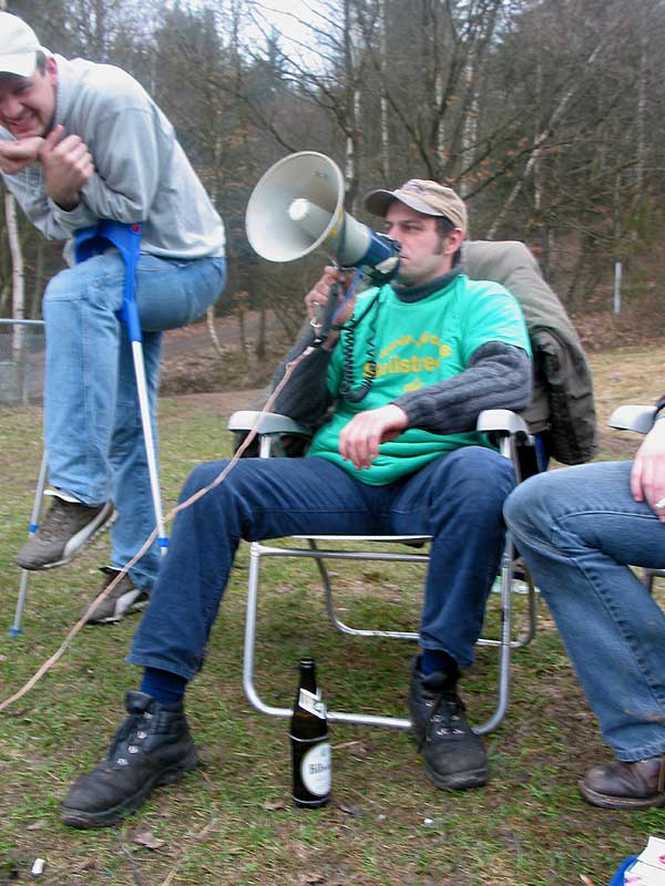 Auch in diesem Winter hat der Belag enorm gelitten, die Löcher in der Fahrbahnoberfläche werden immer größer. Demnächst sollte man auch hier Geld zur Instandhaltung investieren! Geschehen ist dieses an den Absperrzäunen, die modernisiert wurden. In unserem "Wohnzimmer" gibt es ein herzlichen Wiedersehen mit einer großen und gut gelaunten Schevenhütter Fraktion - diese kommt zwar teilweise humpelnd daher, dieses beweist aber einmal mehr, wie motorsportverrückt unsere Freunde sind! Gute Besserung! Natürlich sind die Hütter mit allem ausgestattet, was zu einem zünftigen Motorsportgenuss nicht fehlen darf, warum ausgerechnet Dixi ein Megaphon mitgeschleppt hat, ist mir nicht so ganz schlüssig - hat ihm doch Mutter Natur schon ein nicht gerade zierliches Stimmorgan beschert! Fast vollständig ist die Mannschaft, als auch noch Rudi zusammen mit Basti und seinem Sohn den Weg bis zur Klostertalkurve gefunden hat.