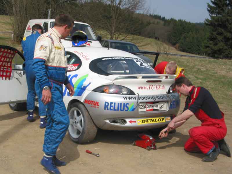 Dort besuchte ich erst einmal das Team-Böckmann wo ich mich mit eigenen Augen von den Aufklebern der Initiative Pro-Steilstrecke auf dem Rennfiesta überzeugte. Die Teammitglieder erklärten mir bereitwillig die Details des Autos und nebenbei lernte ich dann auch die Fahrer Martin Uhler u.Sven Böckmann kennen .
