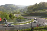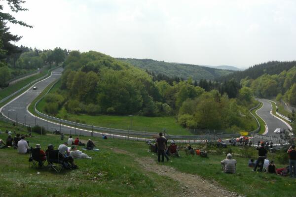 Zum Start des 4-Stunden-Rennens wurde die Steilstrecke, das Klostertal und das Karussell aufgesucht. Bei der Wanderung vom Brünnchen bis zur Steilstrecke bevölkerten deutlich mehr Motorsportfans die Nordschleife. 14 Tage vorher, bei Regenwetter, war die Besucherzahl wesentlich geringer. In der Klostertalkurve unterhalb der Steilstrecke hatten Dixi, Rudi, Marco und Piwi das PS-Banner im besten Blickwinkel für die Fahrer und Teams drapiert.