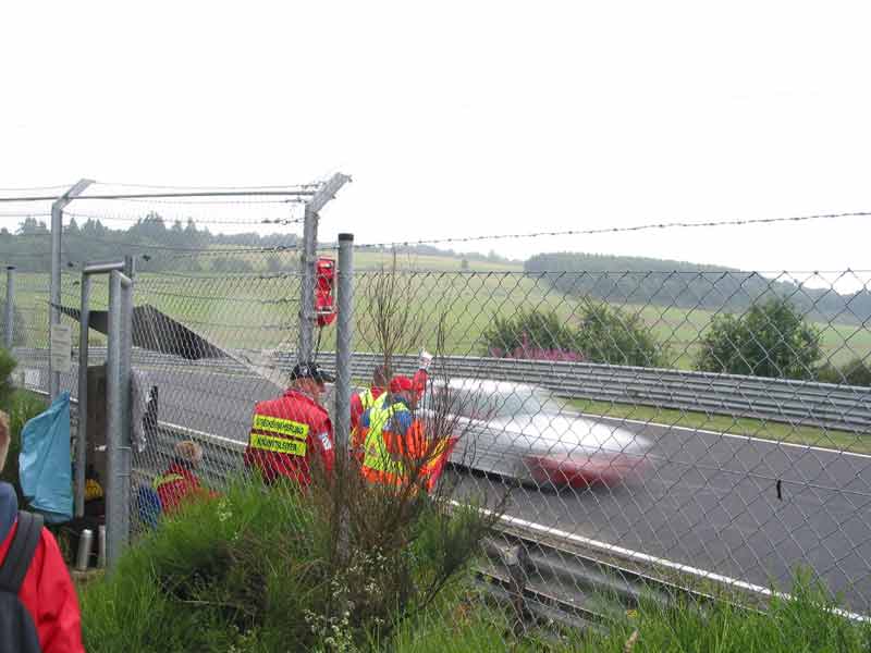 Nachdem wir um 7:30 Uhr in Adenau eingetrudelt waren, wurden wir von Einheimischen dabei beobachtet, wie wir uns mit Kaffee und Brötchen stärken. Um 8:30 soll dann das Training starten und im Wehrseifen sind prompt Motorengeräusche in der Ferne zu hören - es hat uns wirklich gefehlt. Überrascht hat uns an der Strecke, welch ordentliche Arbeit das Räumungskommando nach dem 24h-Rennen geleistet hat - bis auf die Feuerstellen, die den Fahrern seinerzeit das Leben schwer gemacht haben, liegen nur vereinzelt kleine Dinge auf dem Gelände. Wir wissen allerdings nicht, wie es an all den anderen Stellen ausschaut.