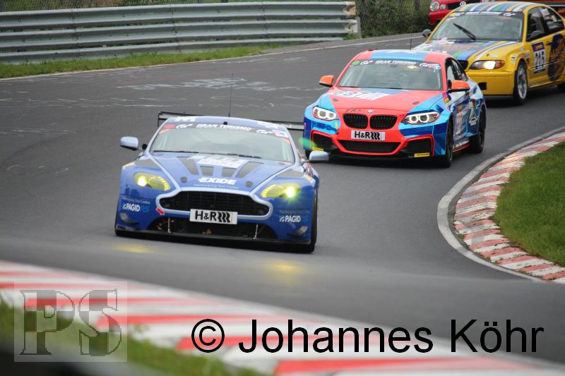 Marc Basseng bei der Überrundung des langsameren Aston Martin Vantage GT4 (Startnummer 179 vom MSC Adenau) problemlos vorbei