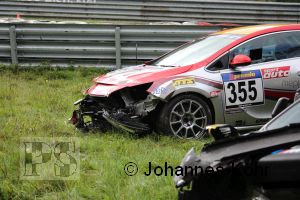 das Starterfeld dezimiert. Einen heftigen Abflug hatten Mario Merten / Jürgen Nett (Opel Astra OPC CUP) nach einer Kollision