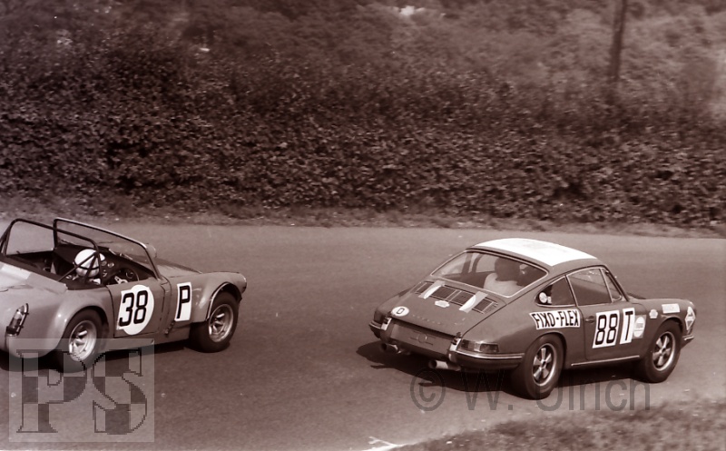 Theo Reuler im Porsche 911 vor dem MG-Prototyp von Gabrielle Konig.