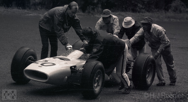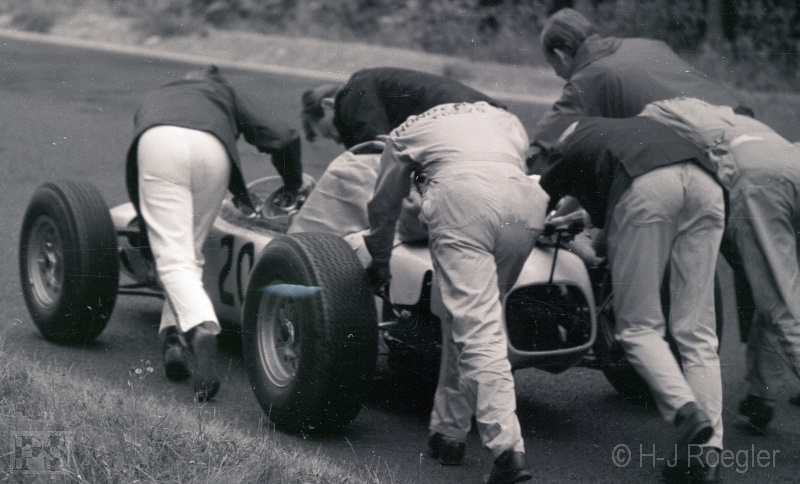 Edgar Barth stellte den Cooper T66 mit Motorschaden im Streckenabschnitt Bergwerk ab.
