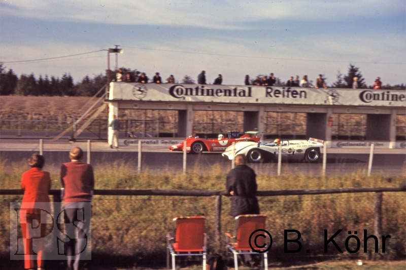 zwischen Niki Lauda (Porsche 908) und Jo Bonnier (Lola T210), der in nichts hinter dem Kampf an der